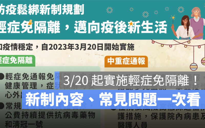 有鑒於疫情逐漸穩定,疫情指揮中心在 3 月初時提出「輕症免隔離」的新制,並在 3/20 起實施,但中重症患者仍需通報。本篇文章將整理輕症免隔離的相關說明、防疫新規,以及 3/20 後如果確診是否需要照常上班上課?是否能請假等常見問題給大家參考。