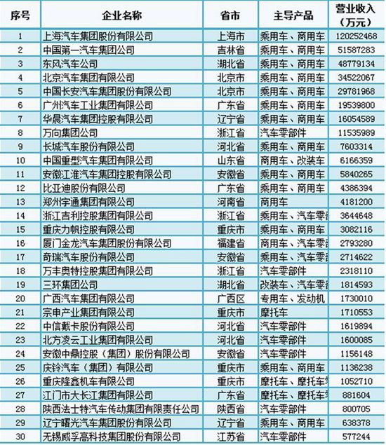 2016年5月26日,中國機械工業聯合會、中國汽車工業協會發佈最新中國汽車工業三十強榜單。上汽集團以2015年1.2萬億元的總營業收入繼續蟬聯冠軍,一汽和東風依然排第2、3位。