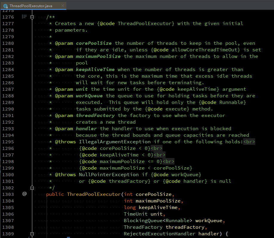 ThreadPoolExecutor 的構造函數非常複雜,這個最完備的構造函數有 7 個參數: