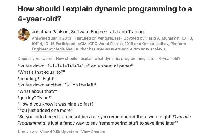 用一句話解釋動態規劃就是 “記住你之前做過的事”,如果更準確些,其實是 “記住你之前得到的答案”。