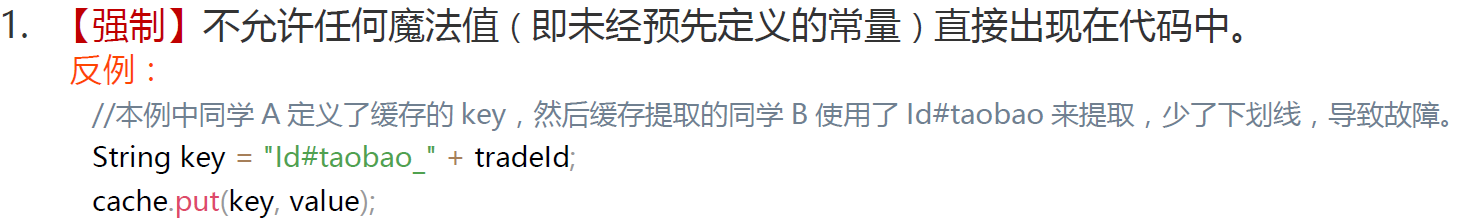 圖中的反例是將數據緩存起來,並使用魔法值加鏈路 id 組成 key,這就可能會出現其他開發人員在複製粘貼的時候,少複製 _ 的情況發生,這種錯誤很難去檢查到,因為讀取緩存不存在,可能會去數據庫讀取,很難察覺到。