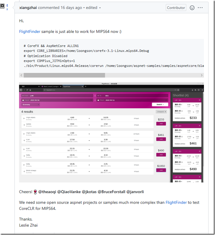 龍芯團隊一直在做net core的mips64移植工作,2020年6月18日完成了里程碑性的工作,在.NET Core 3.1分支上完成了MIPS64 的移植工作,目前已經在github上開源,開源地址:https://github.com/gsvm/coreclr 。具體說明可以參見 https://github.com/dotnet/runtime/issues/38069。 龍芯團隊正在做移植后的測試工作,已經完成了 9500 多項測試,ASP.NET Core示例程序 FlightFinder 已經可以在MIPS64 上正常運行,具體可以參看 https://github.com/dotnet/runtime/issues/4234。