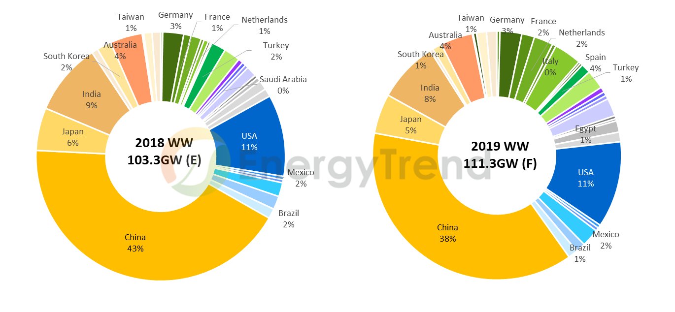 全球市場規模自 2018 年起預計會持穩在 100-120GW 之間,各年度需求量變化幅度將低於 10%。而根據 EnergyTrend 的最新需求報告統計,GW 級市場從 2016 年的 6 個成長到 2019 年將有 15 個,可見市場持續分散化的趨勢。