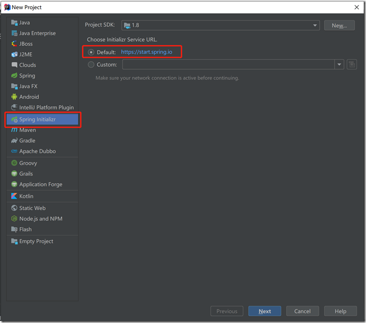 (2)選擇Spring Initializr,默認選擇Default,然後點擊Next:
