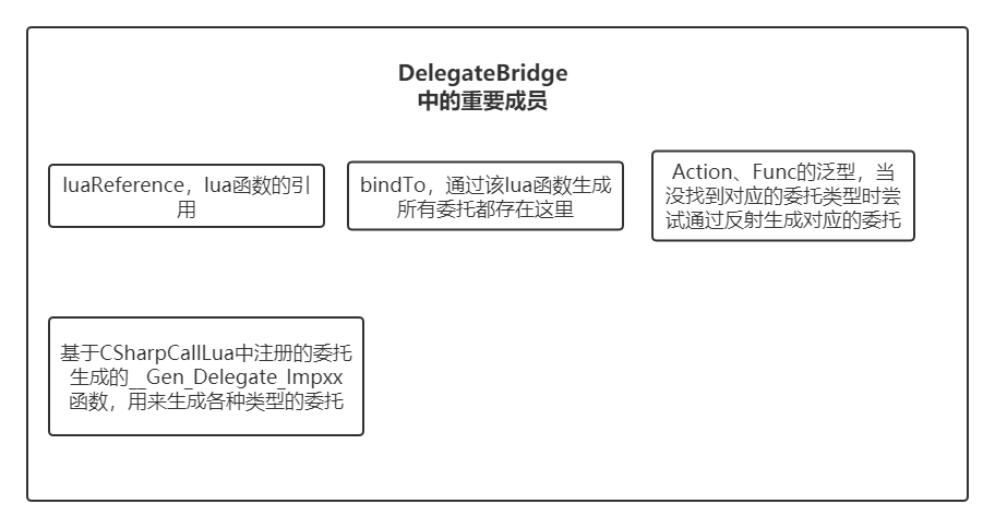 DelegateBridge的功能就是在持有lua函數引用的同時,將這個函數包裝成各種各樣的委託,讓整個轉型過程對開發人員無感知。
